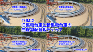 鉄道模型、全般記事 ◆鉄道模型、TOMIXさん旧集電台車と新集電台車の曲線勾配登坂チェック 新集電台車の編成に旧動力車で、曲線勾配は上れるのか試してみました。TOMIXさんの「583系 月光色(品番:92734)」に自作テープLED室内灯を装備させようと思った時から、茨の道を選んだ事に間違いは無いのですが、動力車1両では集電部品を...続きを読む 2020.12.08 鉄道模型、全般記事