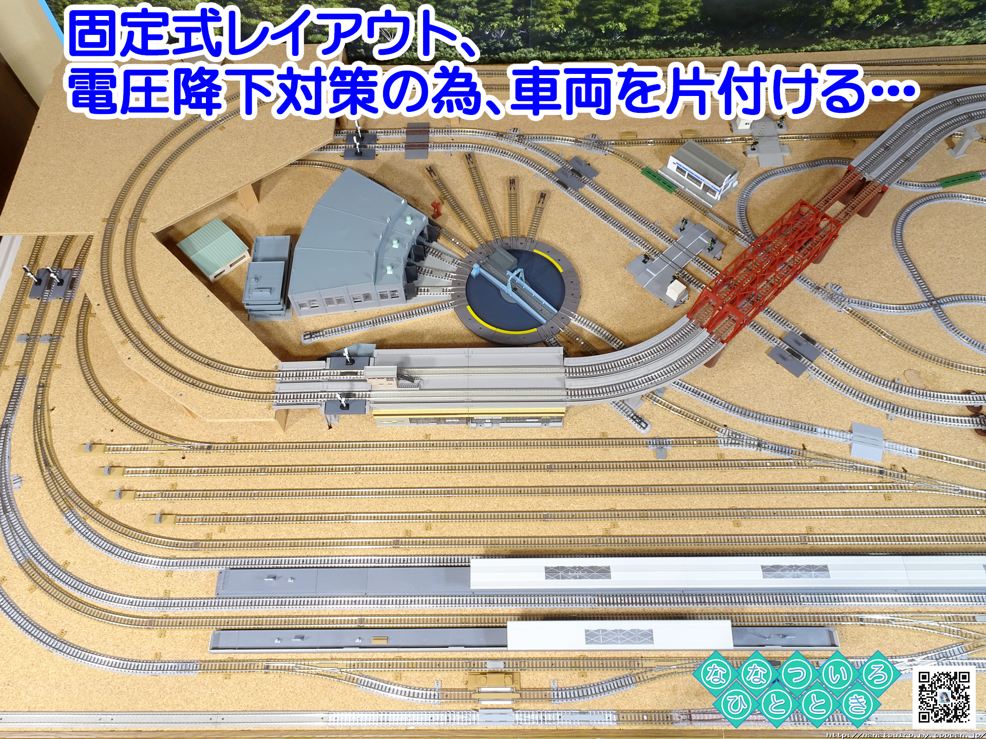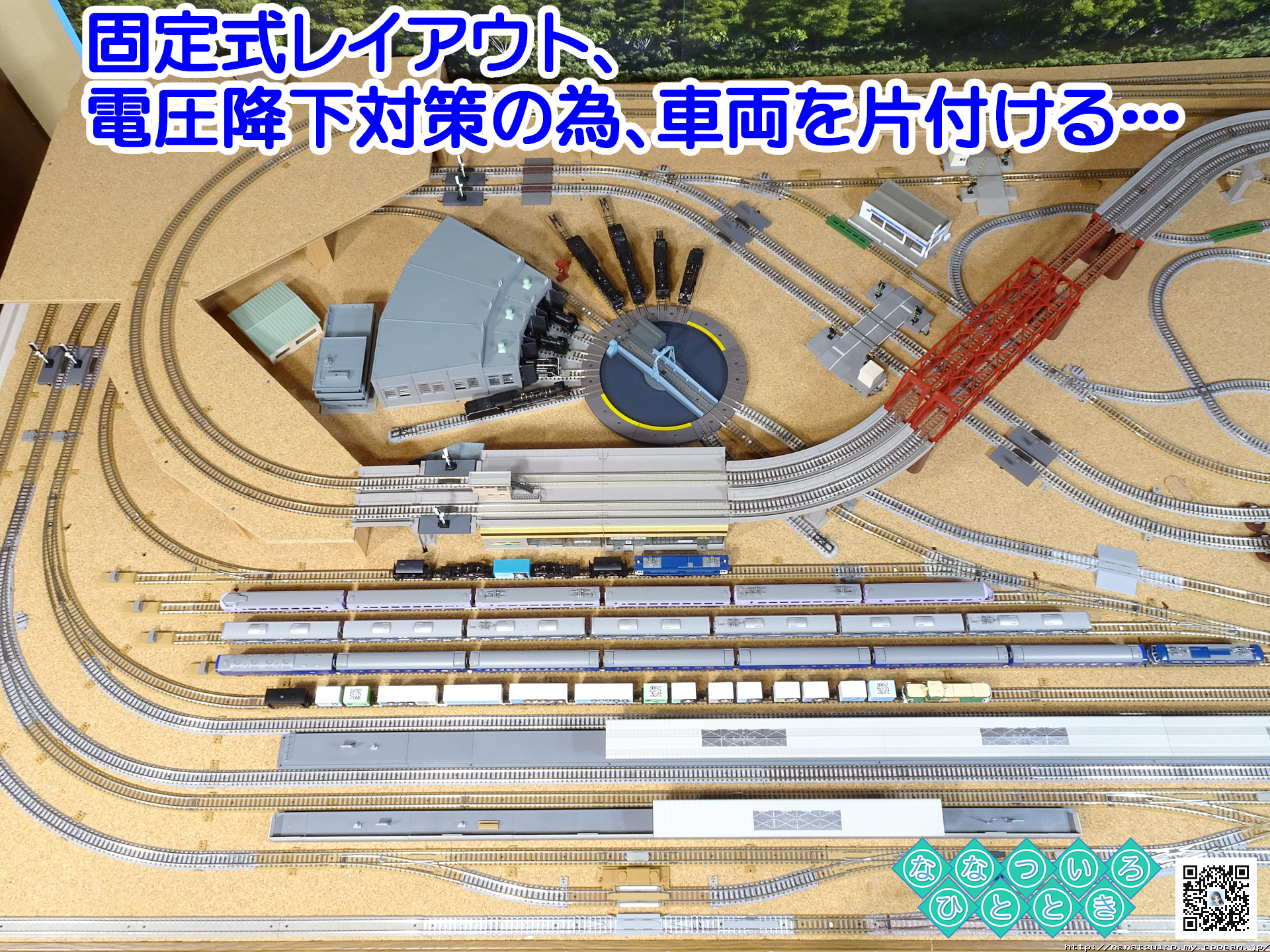 で、私の固定式レイアウトで発生している電圧降下対策の為、レイアウト上に配置している車両を片付ける事にいたします。