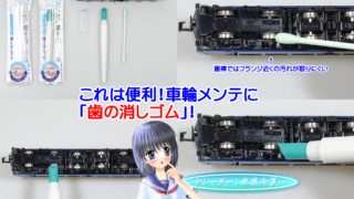 鉄道模型、メンテナンス ◆鉄道模型、これは便利!車輪メンテナンスに「歯の消しゴム」! 今まで車輪のメンテには麺棒を用いておりましたが…ふと、100円均一店で見かけたのが「歯の消しゴム」。これは、文字通り「人間の歯のメンテナンスに用いる」商品です。しかし、この形、材質から、鉄道模型の車輪のメンテナンスに適しているかも知れないと...続きを読む 2021.09.05 鉄道模型、メンテナンス
